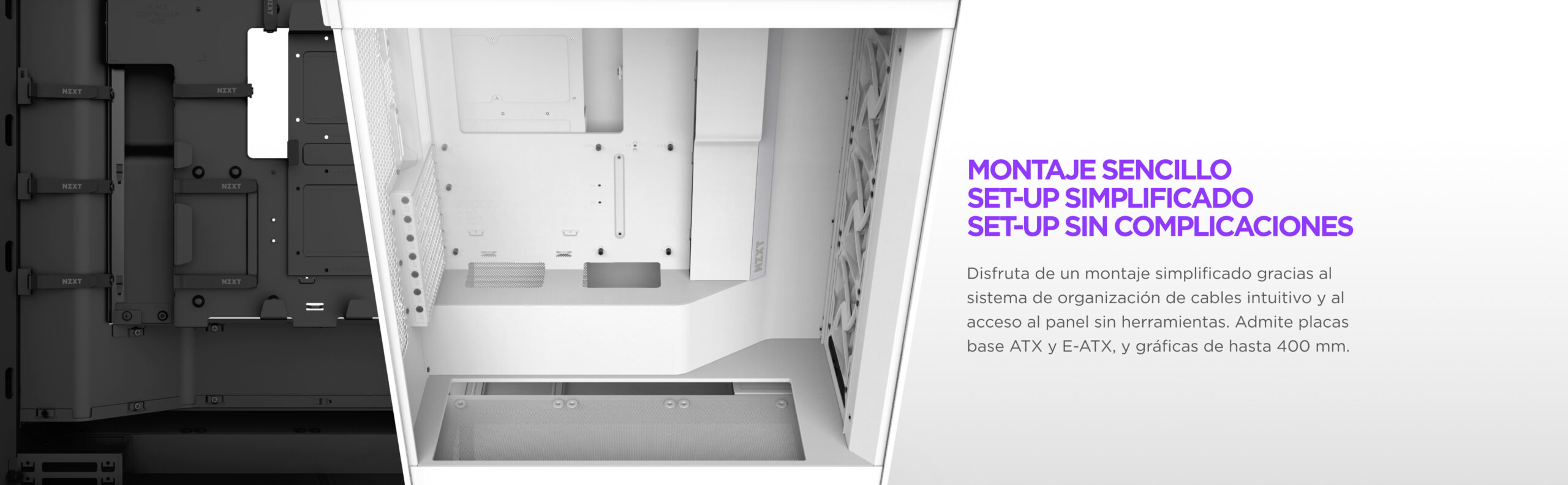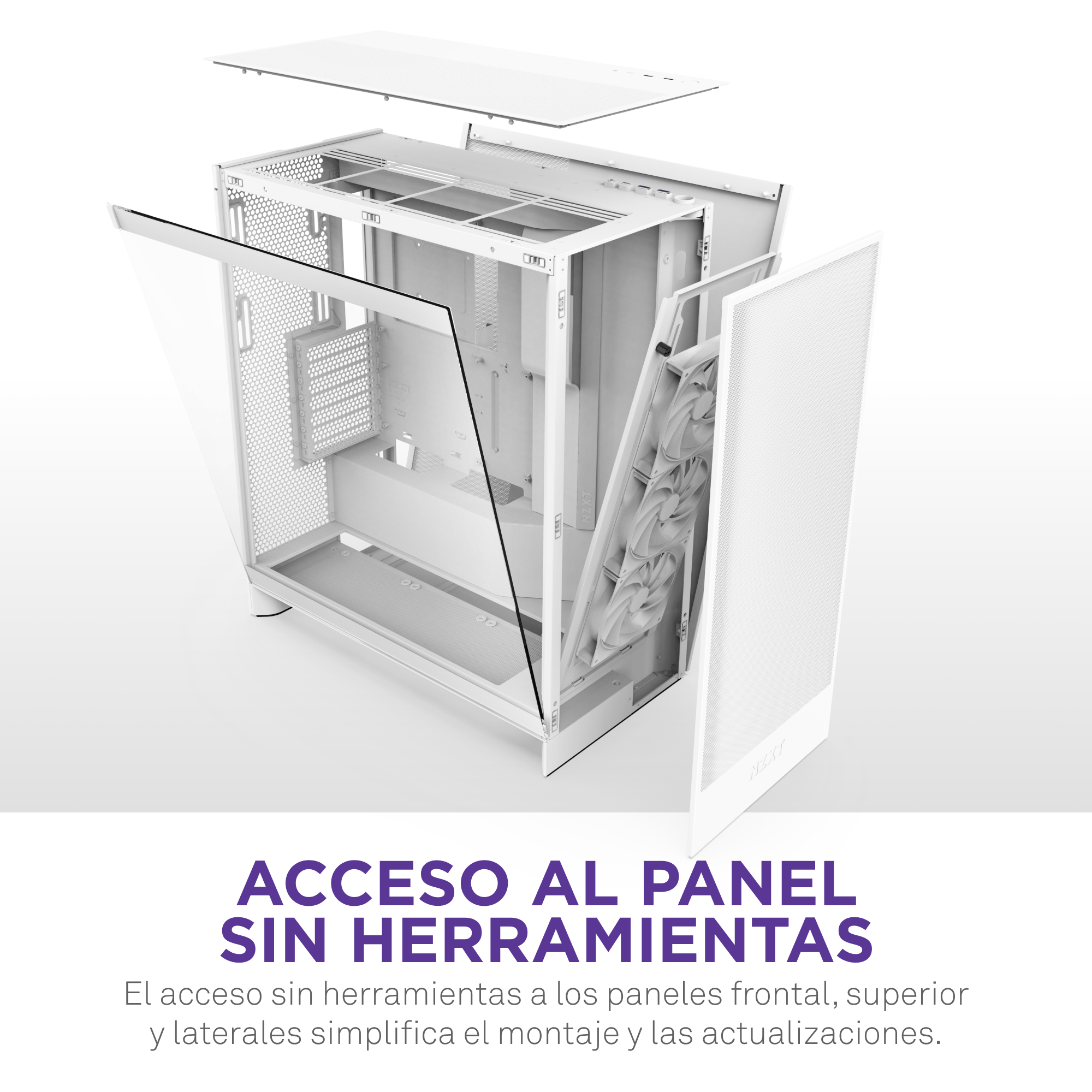 Acceso sin herramientas a los paneles frontal, superior y lateral, facilitando la construcción y actualización del equipo.