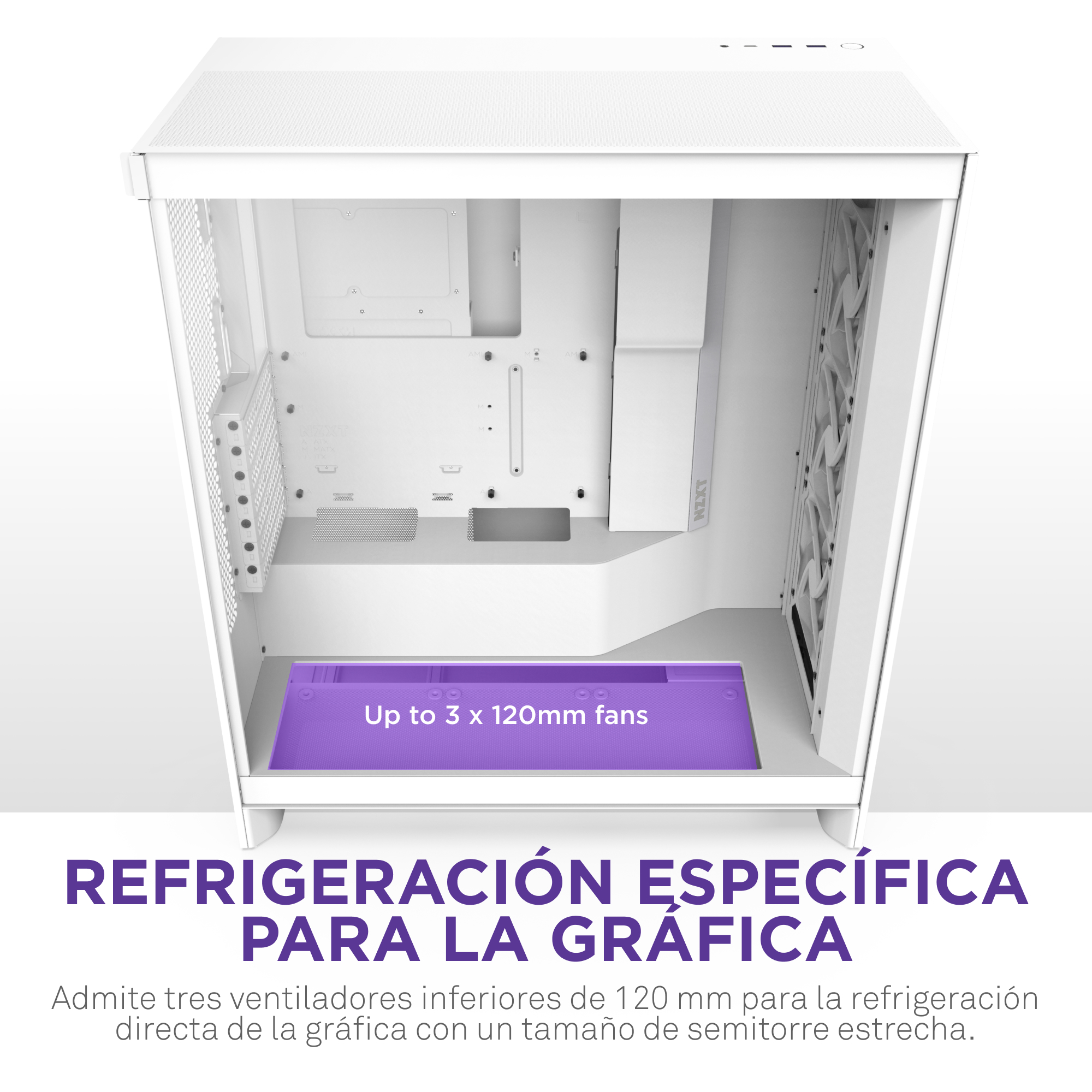 Admite tres ventiladores de 120 mm montados en la parte inferior para una refrigeración directa de la GPU, manteniendo un perfil estrecho de torre media.