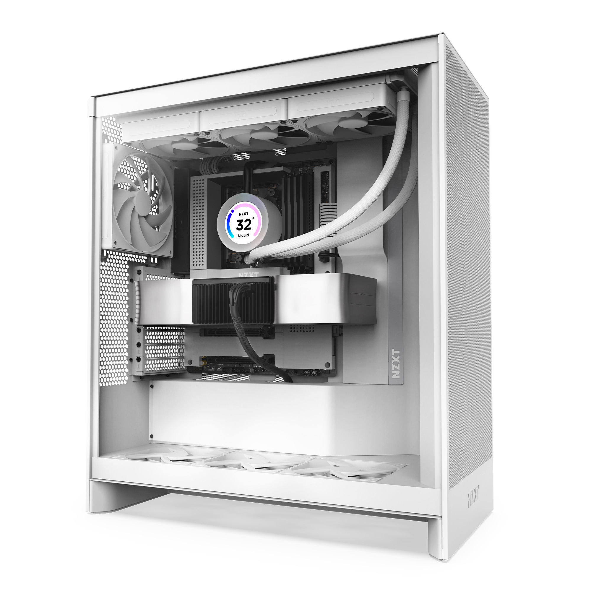 El H7 Flow revoluciona la refrigeración de GPU en un formato clásico de torre media. Su disposición vertical de la fuente de poder permite espacio para 3 ventiladores de 120 mm en la parte inferior, ofreciendo una refrigeración eficiente sin aumentar el tamaño del gabinete.
