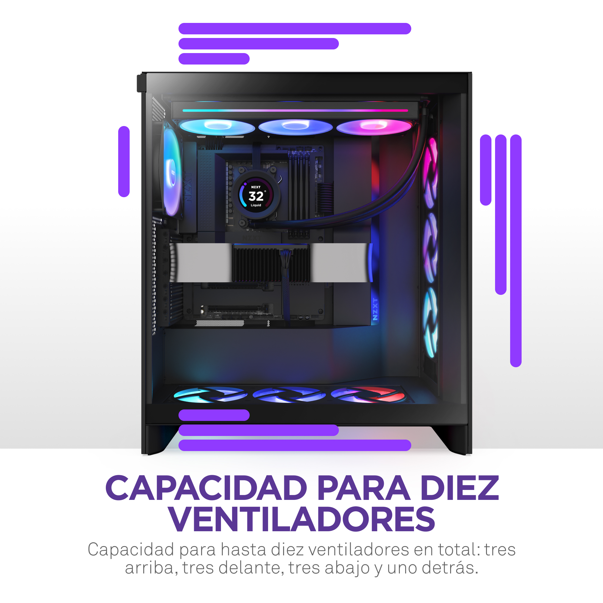 Capacidad para hasta 10 ventiladores en total: 3 en la parte superior, 3 en el frente, 3 en la parte inferior y 1 en la parte trasera.