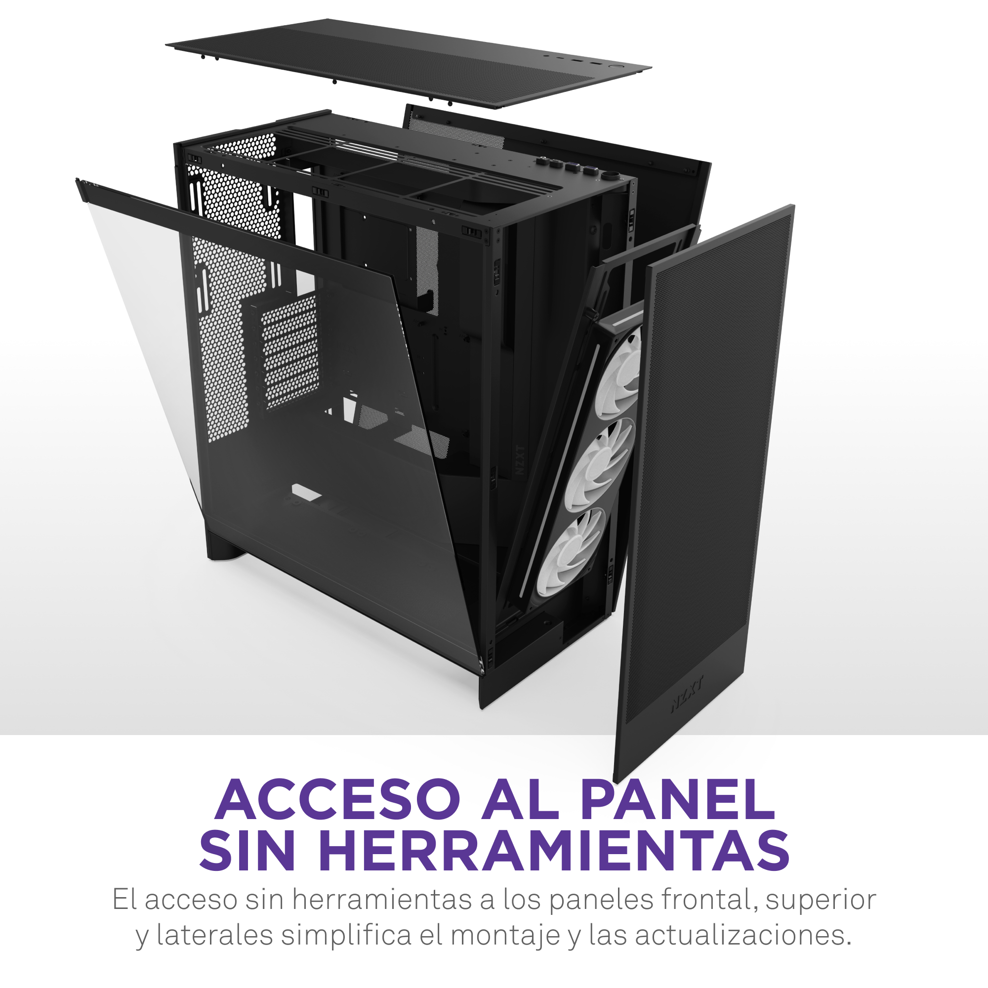 Acceso sin herramientas a los paneles frontal, superior y lateral, facilitando la construcción y actualización del equipo.