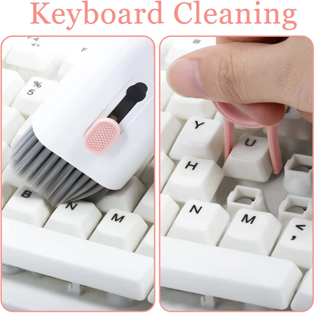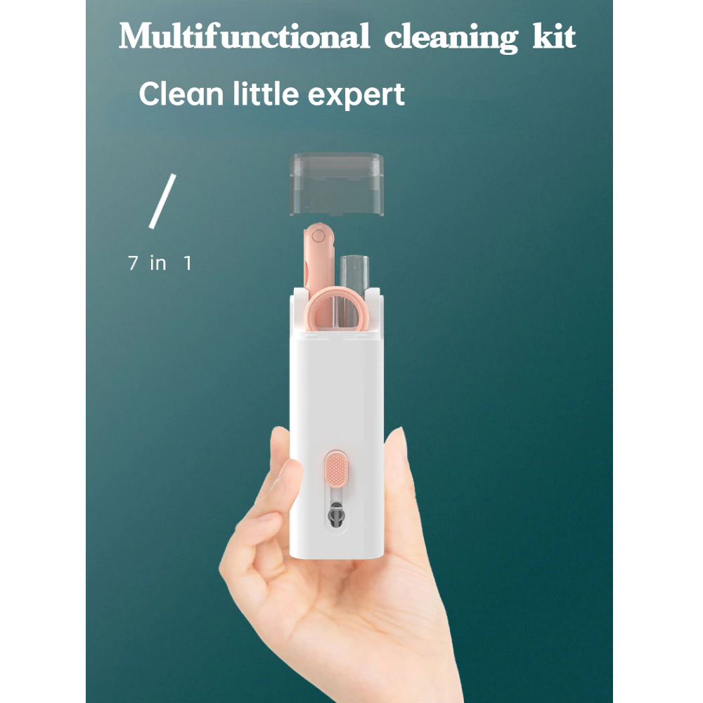 Kit limpiador de electrónica 7 en 1: el kit de limpieza de auriculares de computadora multifuncional 7 en 1 está equipado con una esponja de franela, botella de spray de limpieza (sin aerosol), hebilla de tecla, cepillo de alta densidad y bolígrafo de limpieza multifuncional para satisfacer varias necesidades de limpieza.