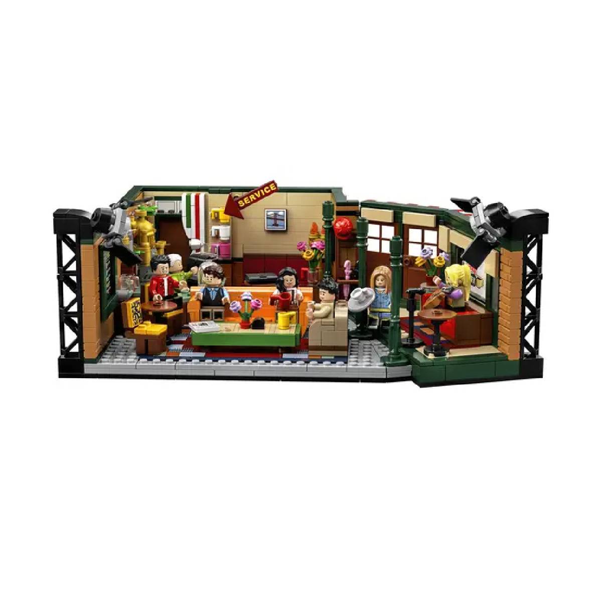 El juguete de construcción que representa la cafetería CENTRAL PERK cuenta con la inconfundible zona principal donde se reúnen, con sofá, butaca, 2 sillas y mesa; una zona de servicio con máquina de café para construir, barra, caja registradora, bote de galletas con 2 galletas, pizarra con el menú y otros genuinos detalles; un escenario para los conciertos con sofá; sillas y mesas adicionales; 3 columnas de color verde (novedad en septiembre de 2019); un paragüero con 2 paraguas; una ventana decorada con el logotipo “CENTRAL PERK”; puertas de entrada; y 2 torres de iluminación de plató para construir con focos.