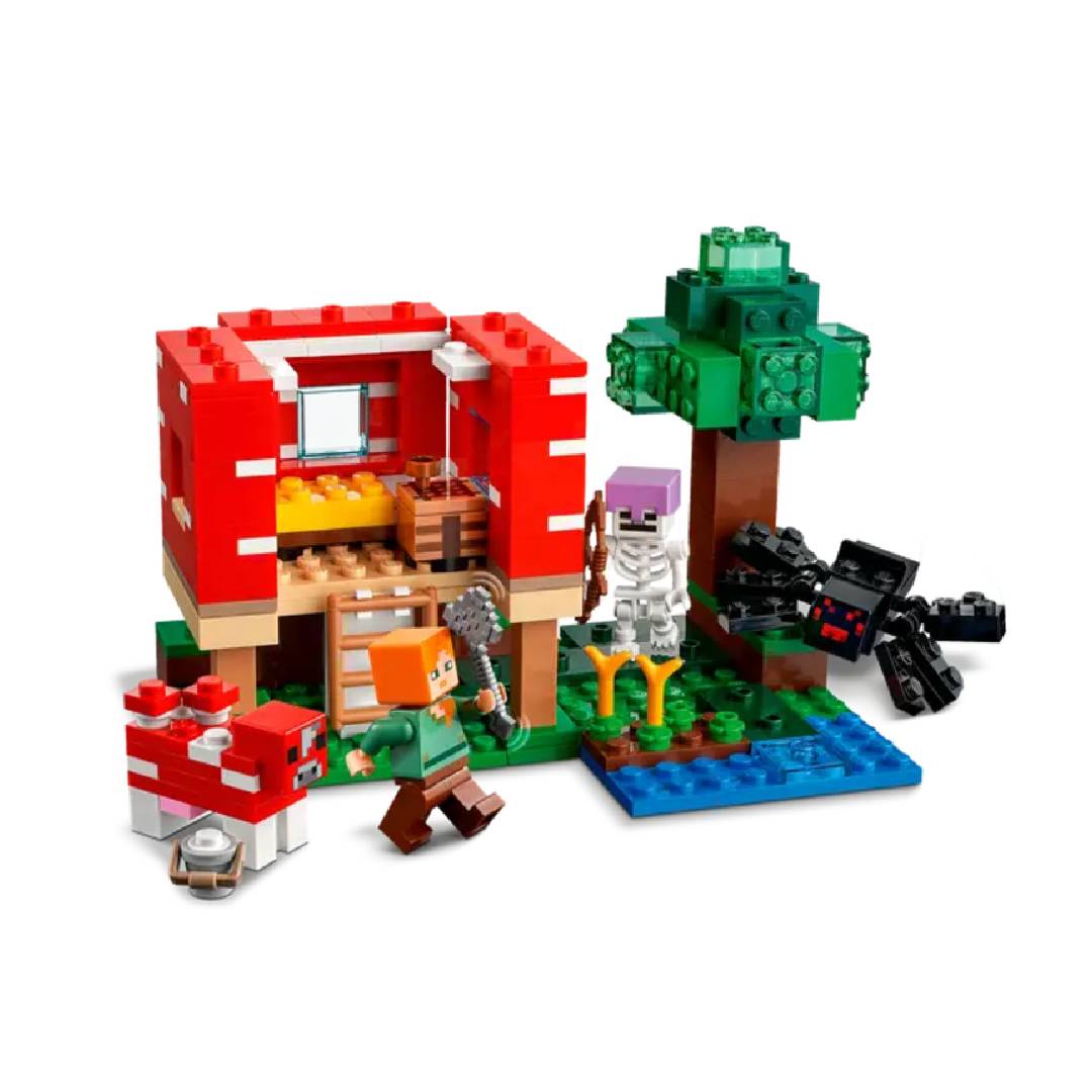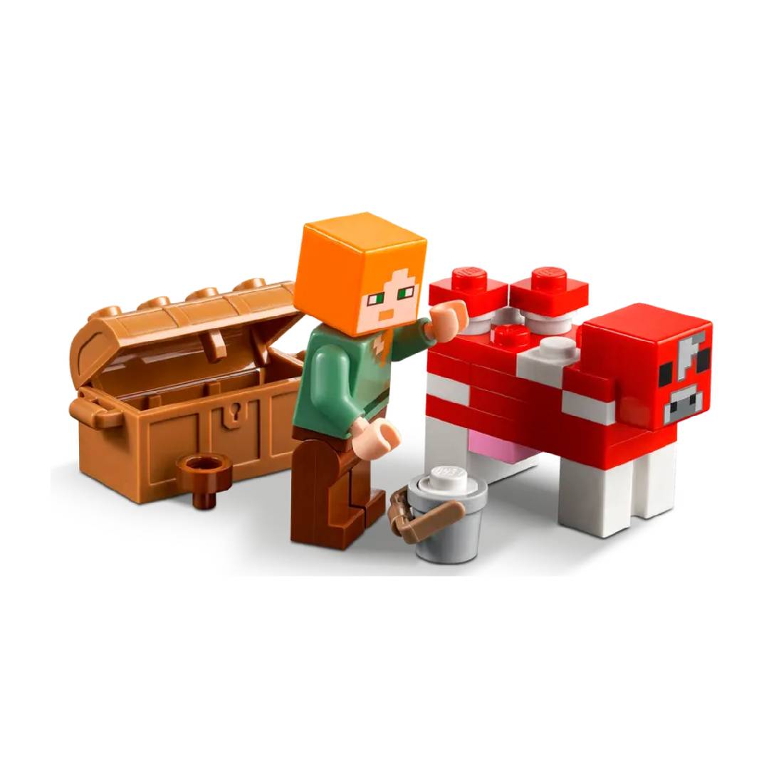Los jugadores de Minecraft pueden ser creativos en la casa de los hongos gigantes. Sus paredes y techo se levantan para facilitar el acceso a la mesa de trabajo y los muebles. Afuera, el héroe de Minecraft Alex usa un tazón para recolectar sopa de la vaca mooshroom. Pero los planes cambian cuando un jockey araña esqueleto arrasa la escena. Las posibilidades de juego imaginativo son infinitas cuando los niños ingresan a la casa de hongos de Minecraft.