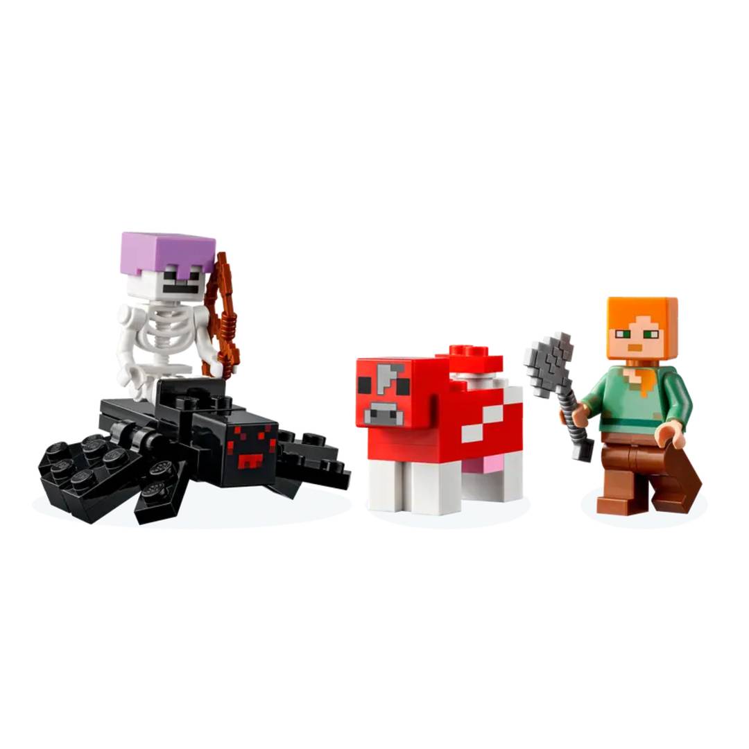 Detalles auténticos: el conjunto incluye los personajes icónicos de Minecraft® Alex, Mooshroom y un Spider Jockey, junto con funciones geniales y accesorios divertidos del juego mÔs vendido.