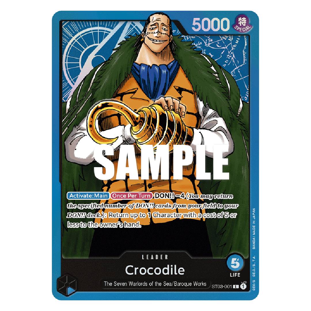 El mazo incluye una carta de líder de Crocodile, uno de los Guerreros del Mar, que permite activar poderosas habilidades y dirigir tu estrategia durante el juego.