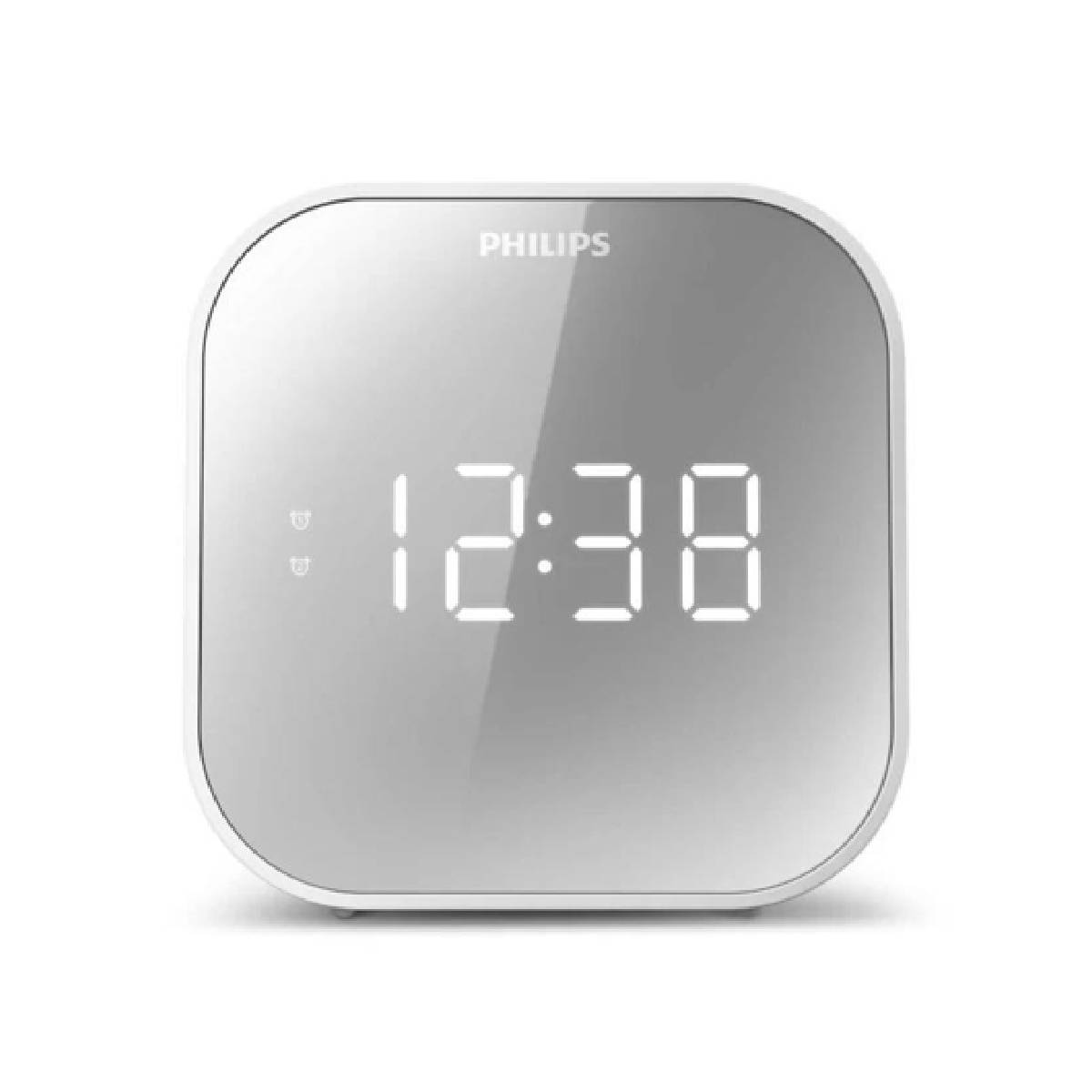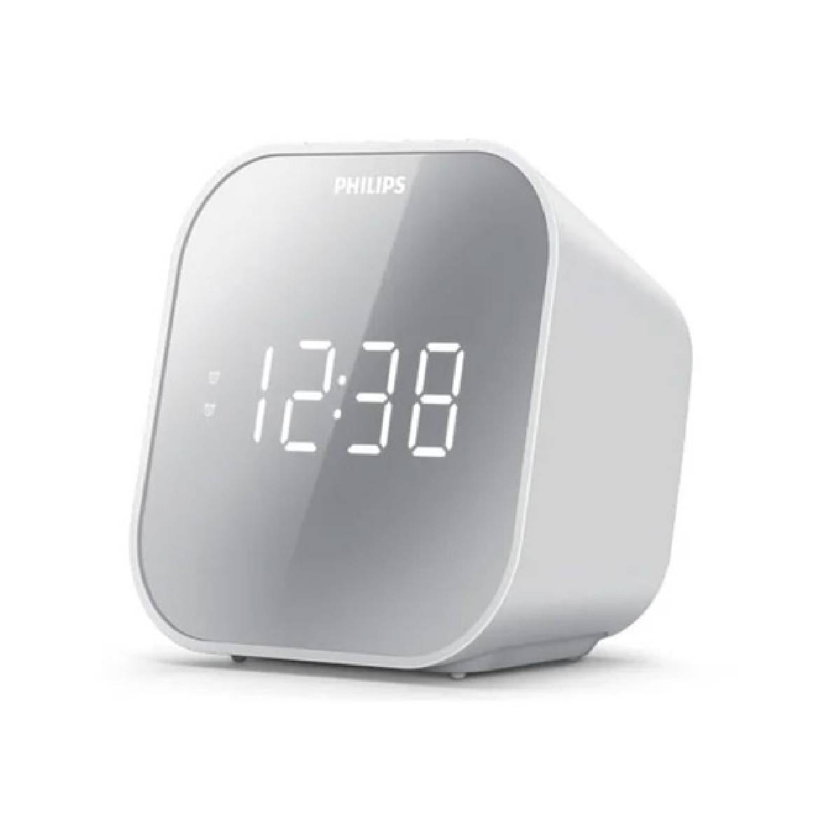 El Philips White Mirror Clock Radio es un dispositivo multifuncional que combina un reloj despertador con una radio, todo en un elegante diseño de espejo blanco. Este reloj radio está diseñado para quienes buscan un dispositivo que no solo sea práctico, sino que también añada un toque moderno y sofisticado a su habitación. A continuación, se detallan sus principales características y beneficios: